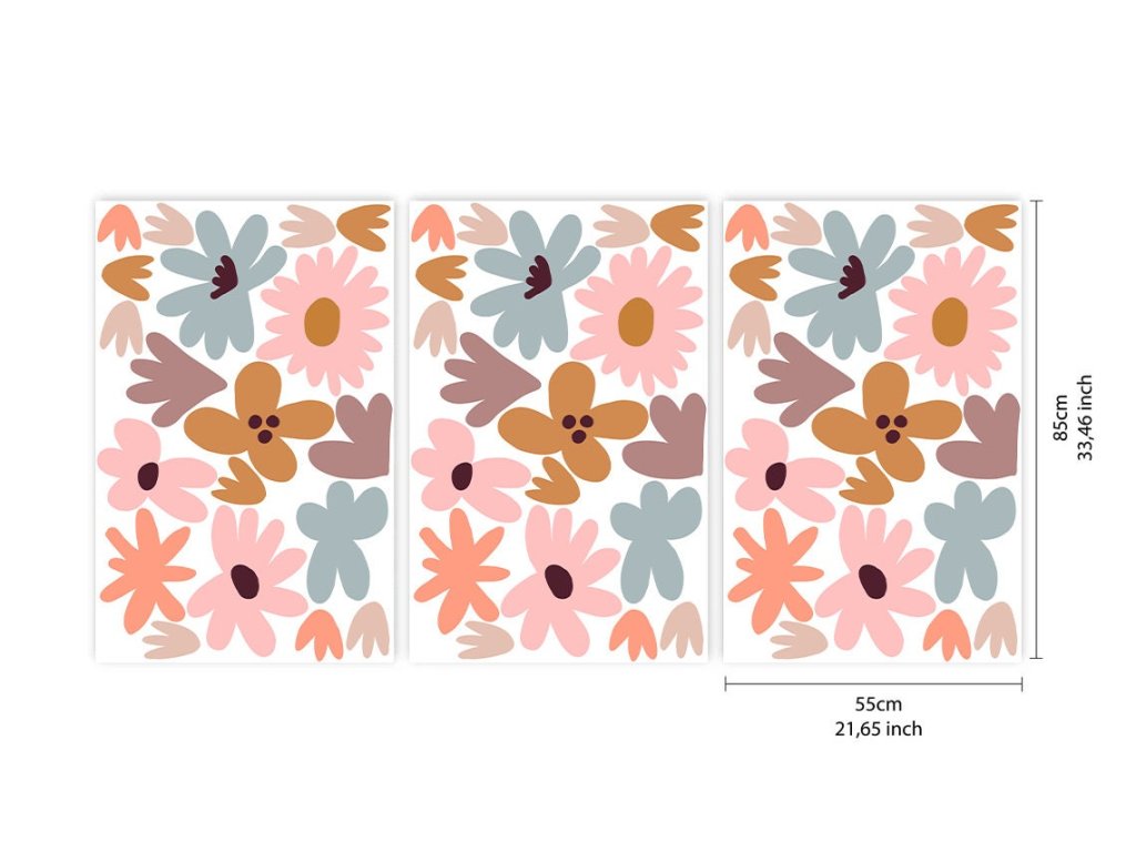 Pozrite si tiež štandardnú sadu nálepiek na stránke https://www.etsy.com/listing/1192701829/floral-wall-stickers-meadow-floral-wall Dosiahnite dokonalý priestor pre svoje dieťa pomocou našich farebných nálepiek na stenu. Nálepka na stenu je jedným z najnovších trendov v oblasti bytových dekorácií. Samolepky si môžete rozmiestniť jednotlivo po celej stene podľa vlastných predstáv. Ľahko sa aplikujú a nezanechávajú na stenách stopy! Dajú sa odlepiť a nalepiť, ľahko odstrániť a ľahko zmeniť ich usporiadanie. Každý hárok sa skladá z rôznych tvarov. Vizualizáciu jednotlivých hárkov nájdete v galérii. Materiál samolepiacich obtlačkov je precízne testovaný a vybraný, aby sme našim zákazníkom zabezpečili prvotriednu kvalitu a čo najjednoduchšiu aplikáciu. CENA JE UVEDENÁ ZA POČET SÁD. 1 SADA OBSAHUJE 3 LISTY. KAŽDÝ LISTA má rozmery 58 x 85 cm (21,65 x 33,46 palca) Jedna sada sa zmestí na 3 - 5 metrov štvorcových steny.Dodatočné parametre