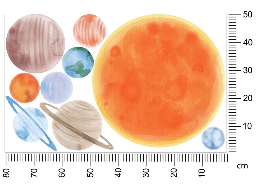 Nechajte svoje deti objavovať vesmír s našou úžasnou nálepkou na stenu. Veľmi ľahko sa odlepuje a nalepuje, takže je ideálny pre deti. Tieto samolepky nezanechávajú na stenách stopy! DÔLEŽITÉ UPOZORNENIE Nálepky sú vyrobené z materiálu na balenie na stenu. NIE sú ľahko odlepiteľné a nalepiteľné. Ich lepiaca schopnosť je oveľa väčšia. Preto buďte pri aplikácii opatrní. Ak ich budete chcieť odlepiť, môže dôjsť k poškodeniu steny. Najmä ak máte čerstvo dokončenú alebo vymaľovanú stenu. V takom prípade odporúčame pred aplikáciou počkať niekoľko týždňov, aby stena poriadne vyschla.Dodatočné parametre
