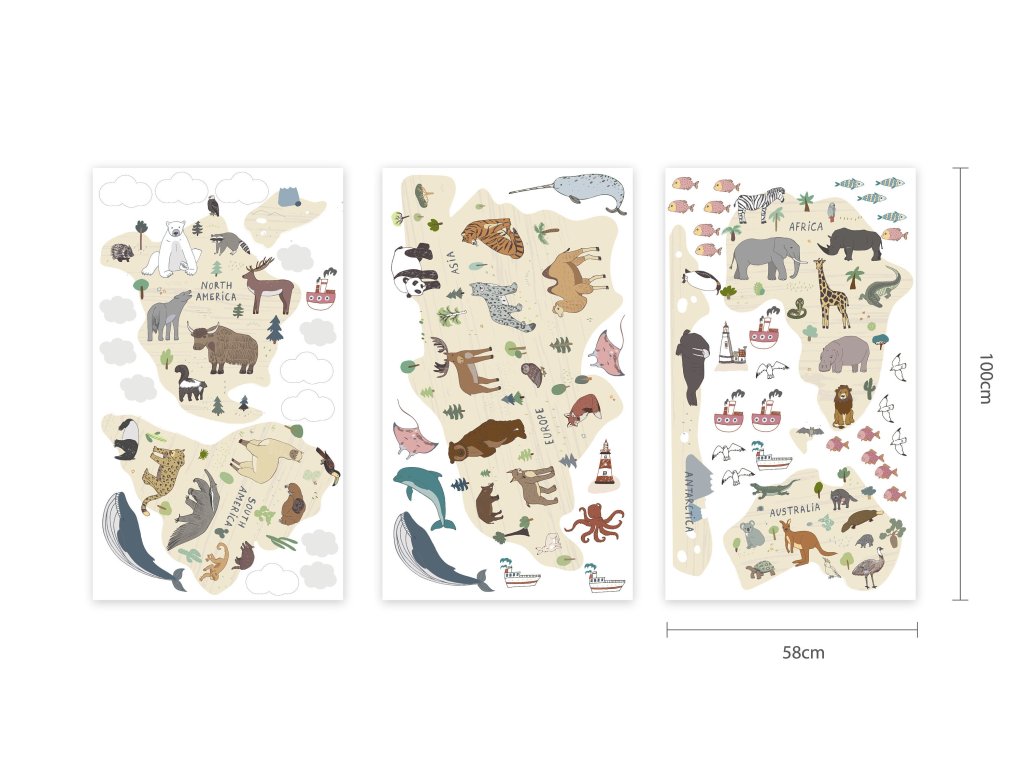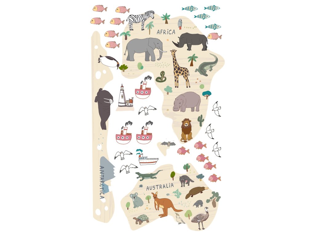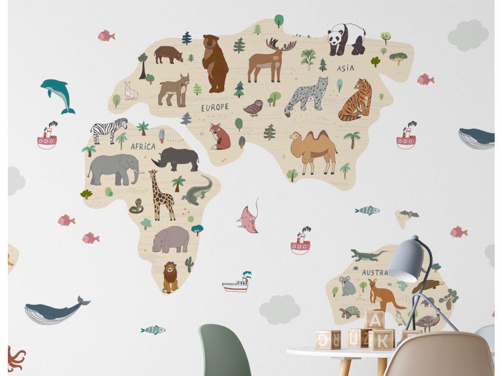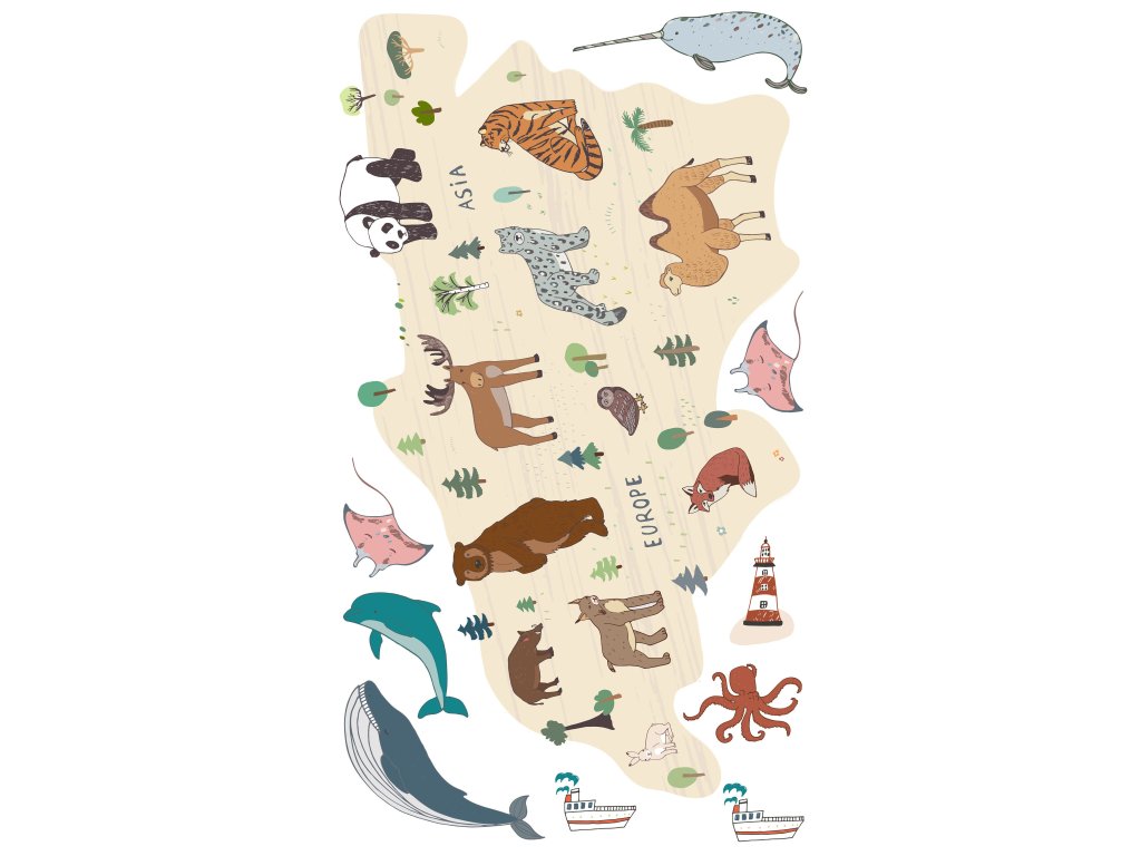 Zvieracia mapa sveta Nálepka na stenu. Dekorácie detskej izby